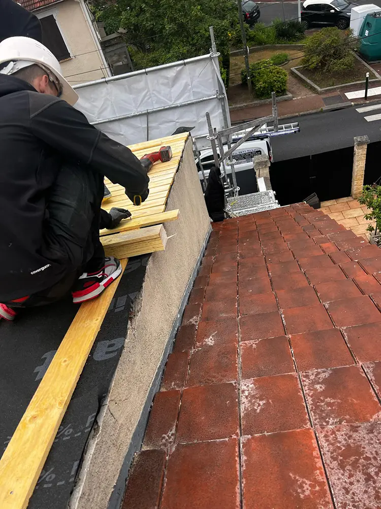 Avant de commencer les travaux, nous avons pris soin de sécuriser le périmètre autour de la toiture et de protéger les zones sensibles pour éviter toute dégradation. Nous avons également vérifié l’état des éléments de la toiture afin d’assurer qu’il n’y ait pas de défauts susceptibles d’affecter l’installation du nouveau chien-assis.